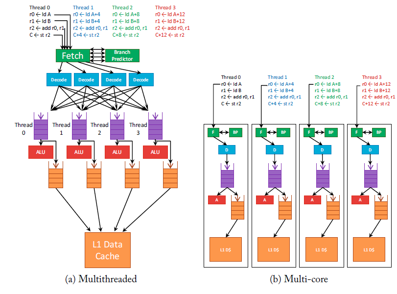 - Multithreading: only one decoder, execution unit, etc, so can’t multithread