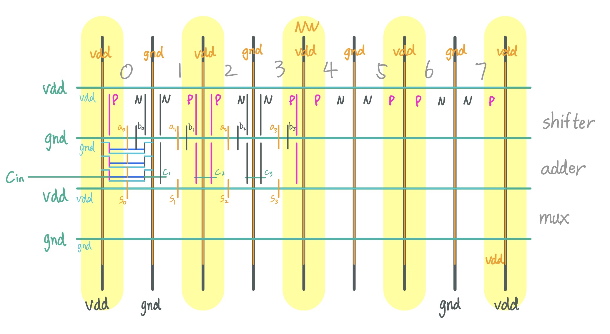 - Reserve these long, continuous rails for VDD and GND
