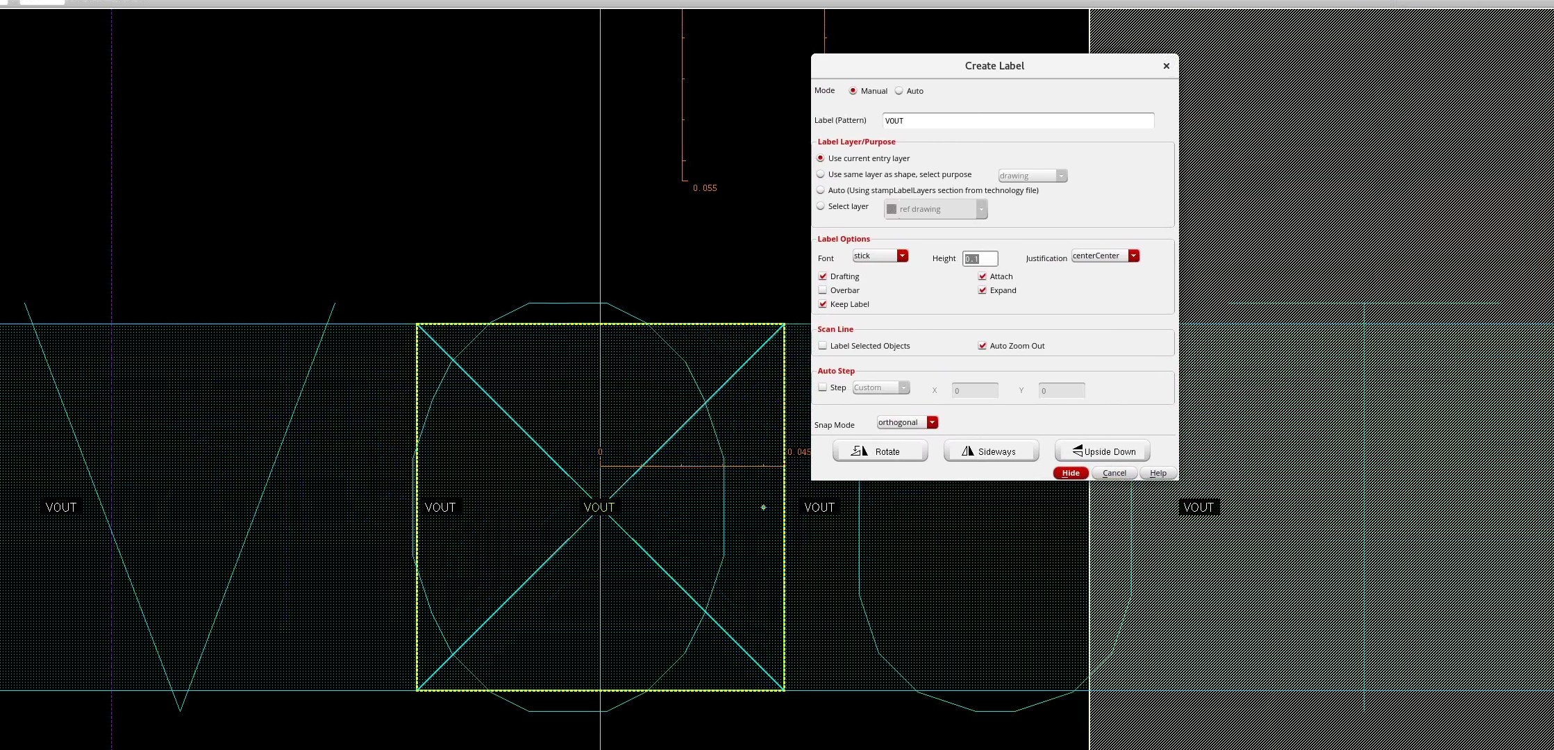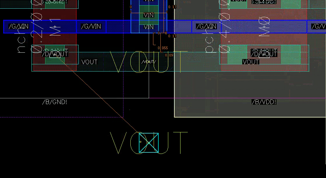 In this case, first check if Virtuoso recognizes the pin. Try moving the pins around and see if the label (“VOUT”) and the cross shows up. If not, delete the pins and “Connectivity/Update/All from Source” again. Make sure you select the “Create Label” option