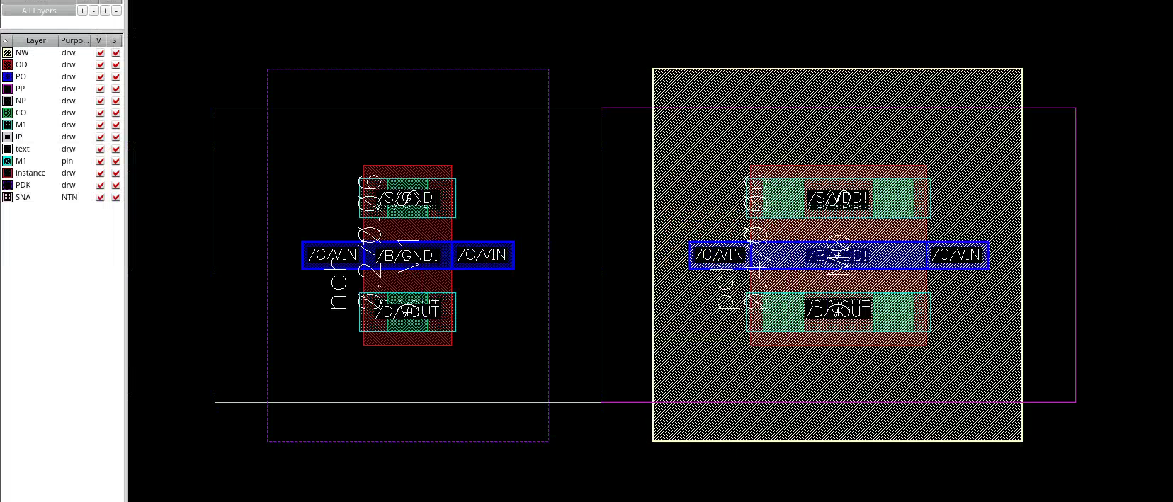 - You should see matching instances between schematic and layout. Selecting one highlights the other.