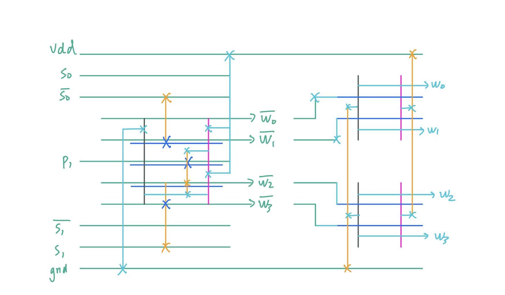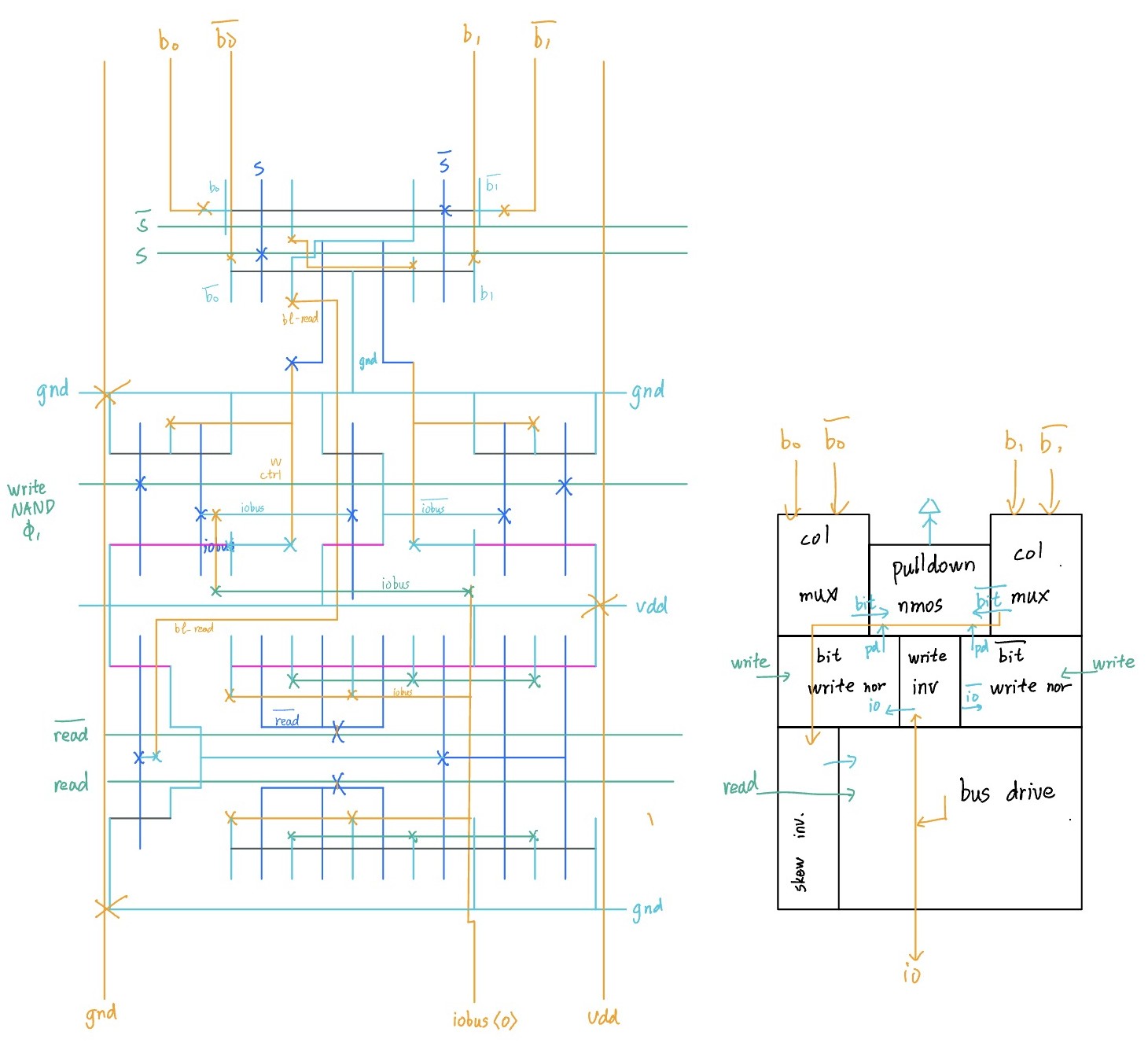 Now to the interesting (and hard) part. In lecture, we know that we can control the write pulldown NMOS of bit by write AND iobus (iobus_bar for bit_bar). For stability, we also want to qualify this with phi_1. The logic is: