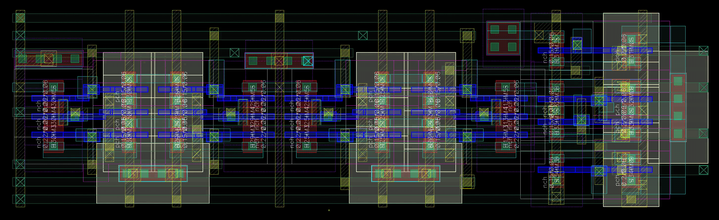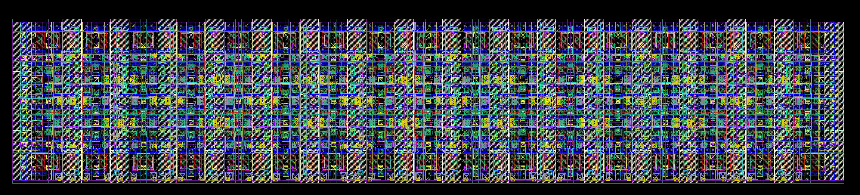 We initially attempted a single-row diffusion-shared layout and missed by a fraction of um :( The final solution uses gate sharing instead.