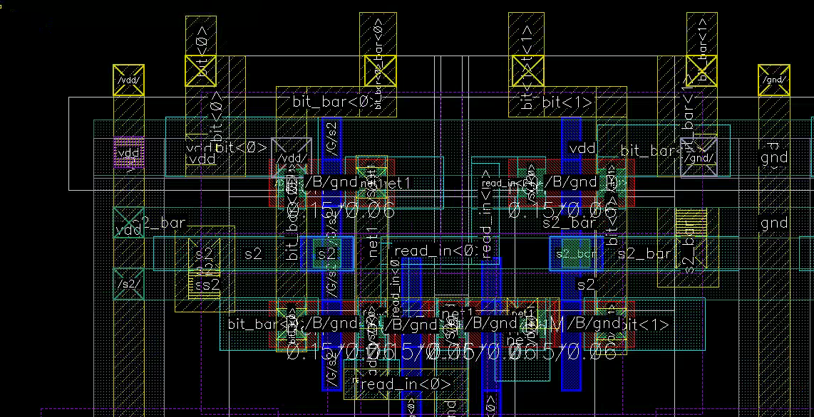 bit<0>and to the right ofbit_bar<15>(GND). You should get 16.8 um. If not, something is misaligned. - Add M2 pins for power and bitlines. They don’t have to be perfectly square.