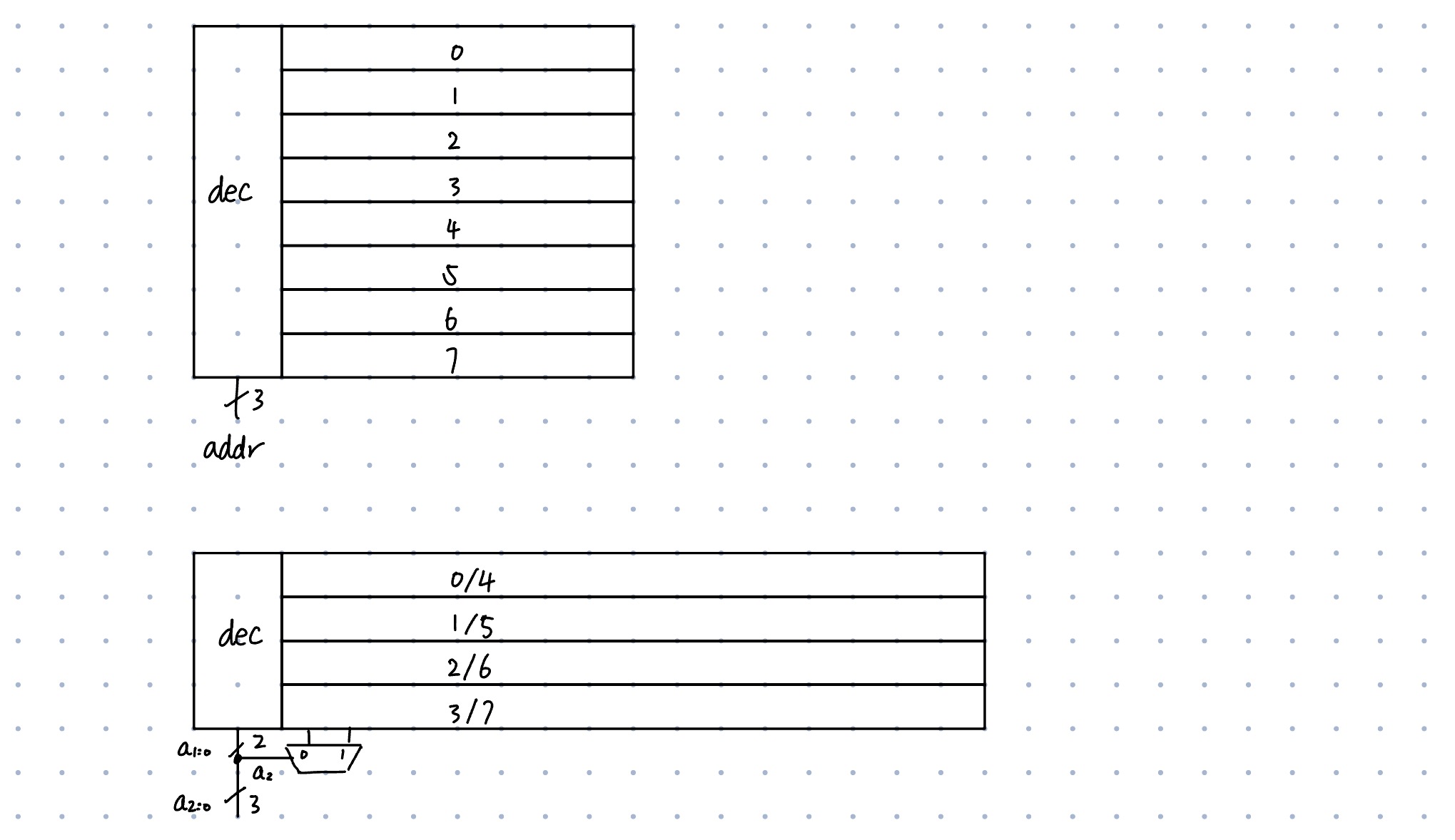 - Logically, the array is 8x8. (8 wordlines, 3-bit addresses; 8 bits for