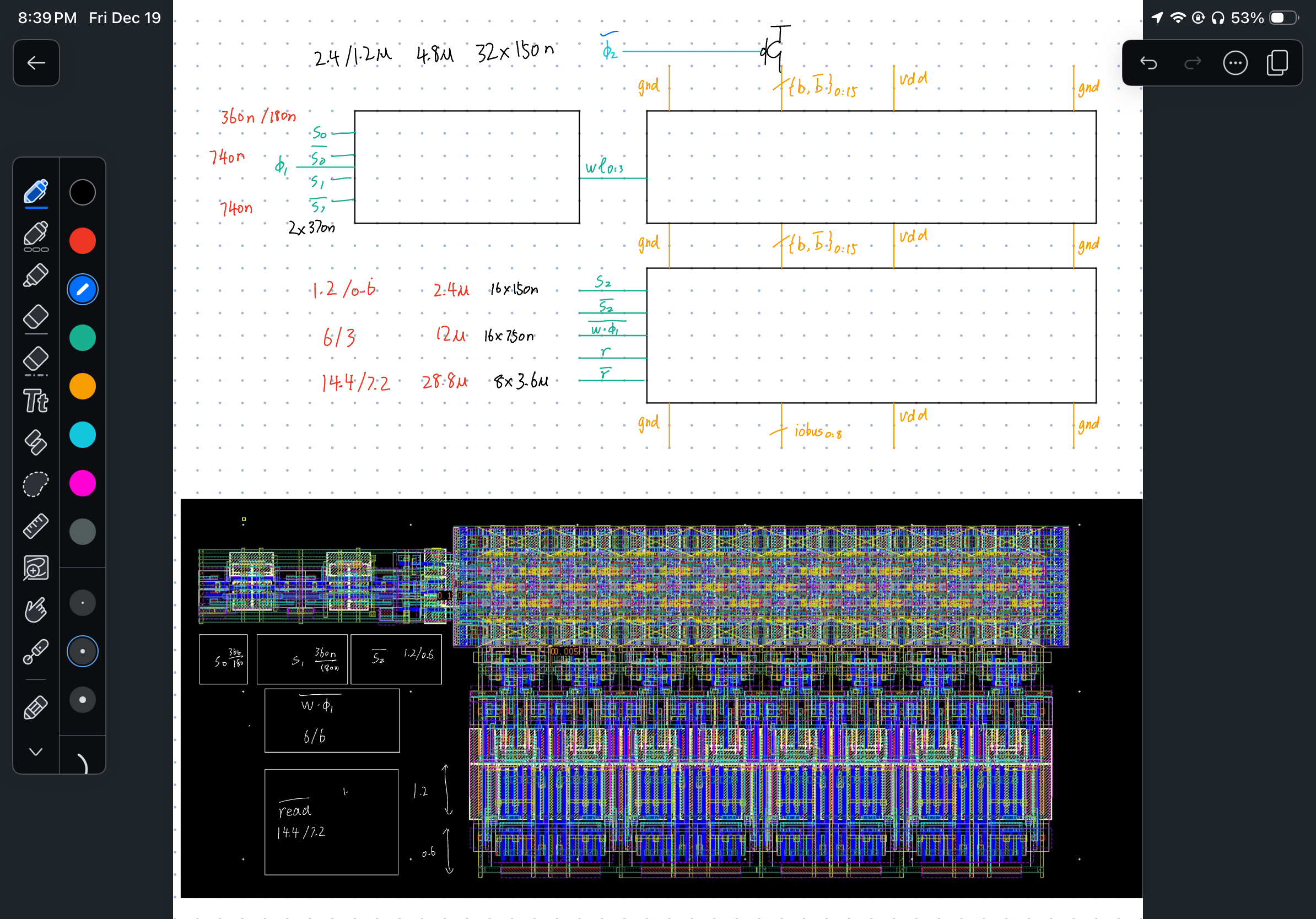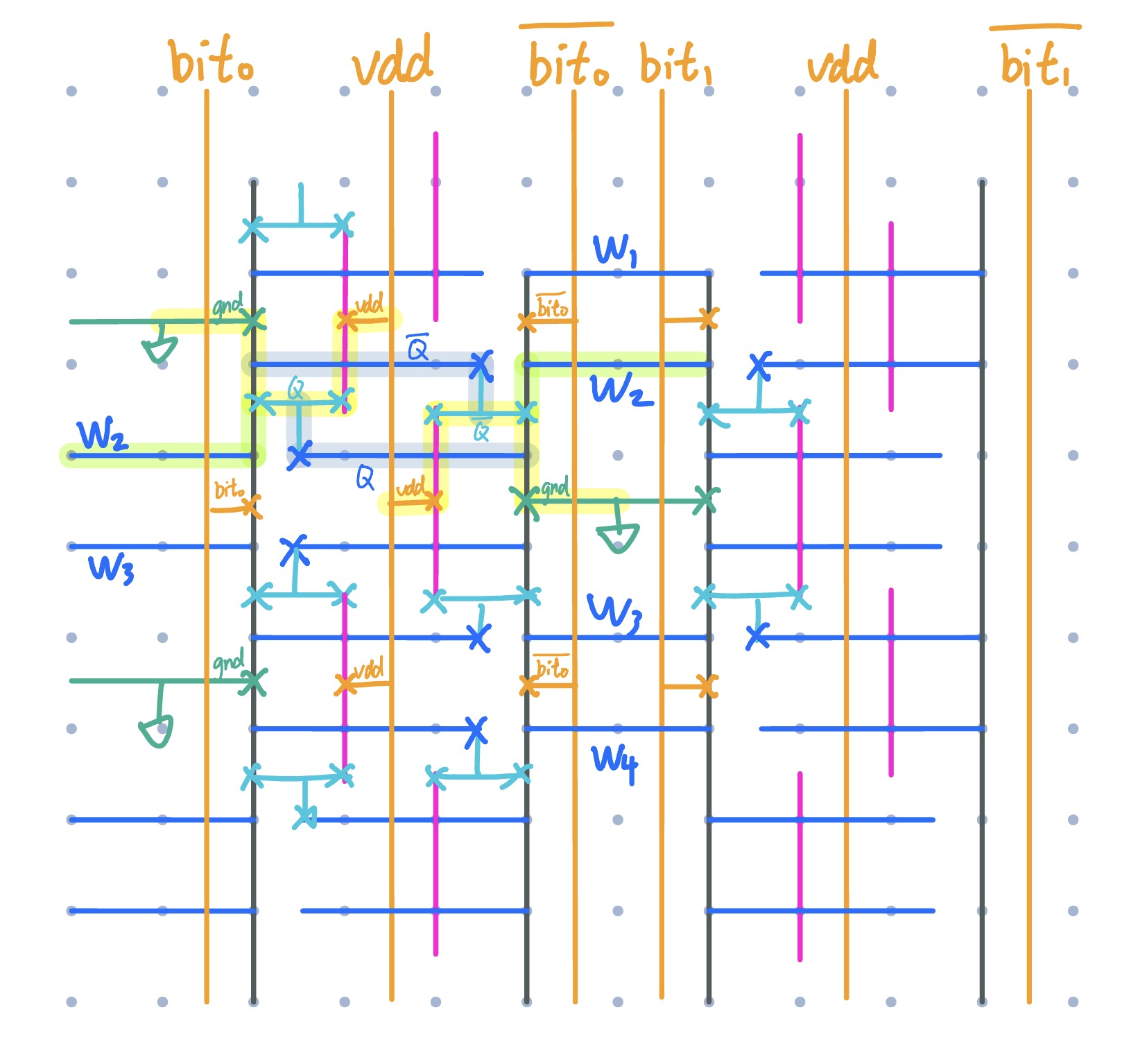 Below is the 2-bit (4 bitline pairs) R/W schematic, closely following lecture
