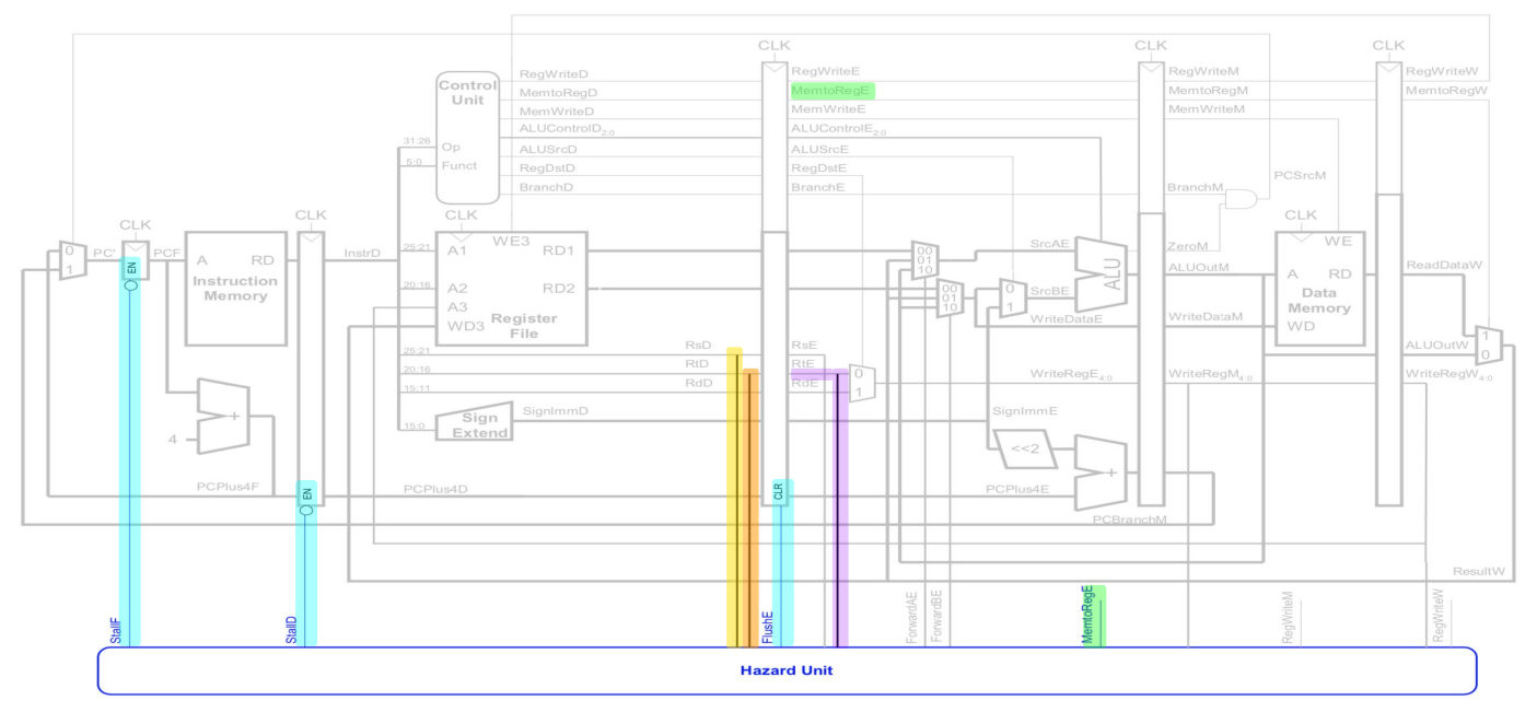 StallF: Freeze PCStallD: Freeze current instructionFlushE: Clear the already decoded operands, creating a bubble (NOP) in execution The flushed data will create a bubble (NOP), which will give extra cycles for data to become ready
